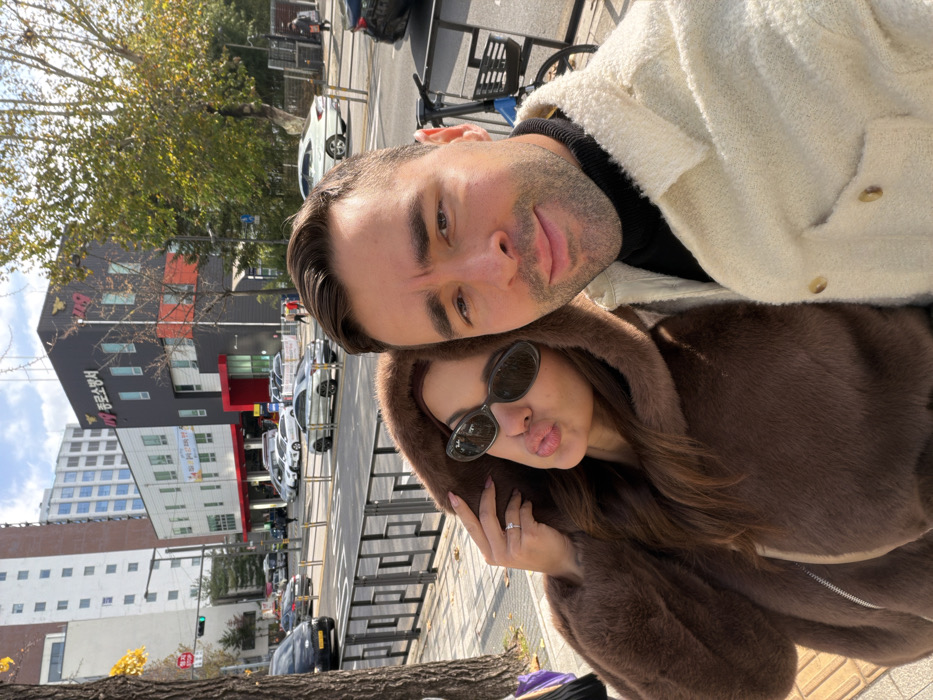 A selfie captures a couple outdoors during daylight. The man, with dark hair and light skin, wears a beige jacket and a black sweater. The woman, also with light skin, wears sunglasses and a brown fur coat with a hood, puckering her lips. Her left hand, adorned with a ring, is visible. A sidewalk runs diagonally across the lower half of the image, with buildings and parked cars visible in the background. A tree trunk is visible in the lower-left corner of the frame.