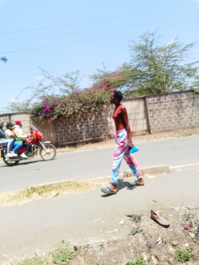 The image depicts an outdoor street scene in Nairobi, Kenya, under a clear blue sky. In the mid-ground, a dark-skinned female figure, viewed in profile, walks from right to left. She wears a rust-colored sleeveless top, pink, blue, and white tie-dye trousers, and dark slip-on sandals. She holds a small, bright blue object in her right hand. To her left, on the asphalt road, a red motorcycle with three occupants moves from left to right. The lead occupant (driver) wears a light-colored top and a red hat, while two passengers are seated behind, one in yellow and one in blue attire. The background features a light-colored brick wall adorned with green vegetation and pink/purple bougainvillea flowers. The foreground consists of dry earth with sparse green growth, where a single brown shoe or sandal rests on the ground to the right.