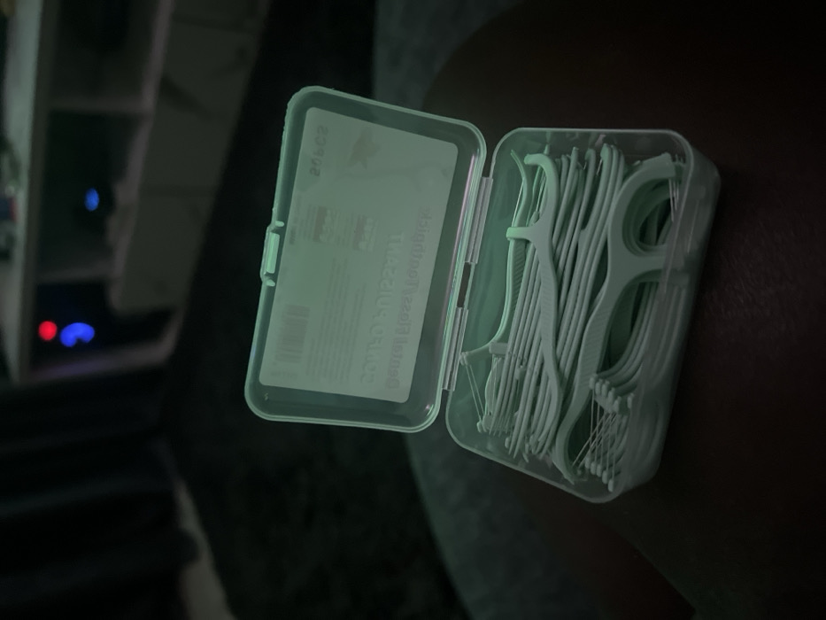 An open, translucent container is filled with white floss picks. The container rests on a dark surface, possibly a person's leg. A shelf unit is partially visible in the blurred background to the left, showing some electronic equipment with illuminated lights. The lighting in the room is low and dim, giving the image a greenish hue.