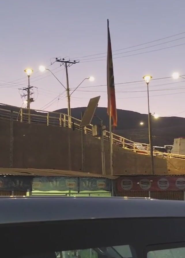 static outdoor scene at what appears to be dusk or dawn. The sky is a pale purple and blue. In the foreground, the top of a silver or gray car is visible. Above the car, there is a low structure, possibly a store or food stall, with a roof that has branding or repeating logos on it. Behind this structure is a raised bridge or walkway. Cars are parked on the walkway. A tall pole stands near the walkway, flying a flag with vertical stripes of green, yellow, and red. The flag is not fully unfurled and hangs limply. Street lights illuminate the scene, casting a warm glow. Power lines and poles are visible in the background. In the far distance, a dark, low-lying mountain range can be seen against the sky. The overall impression is of a quiet, urban or suburban setting at twilight.