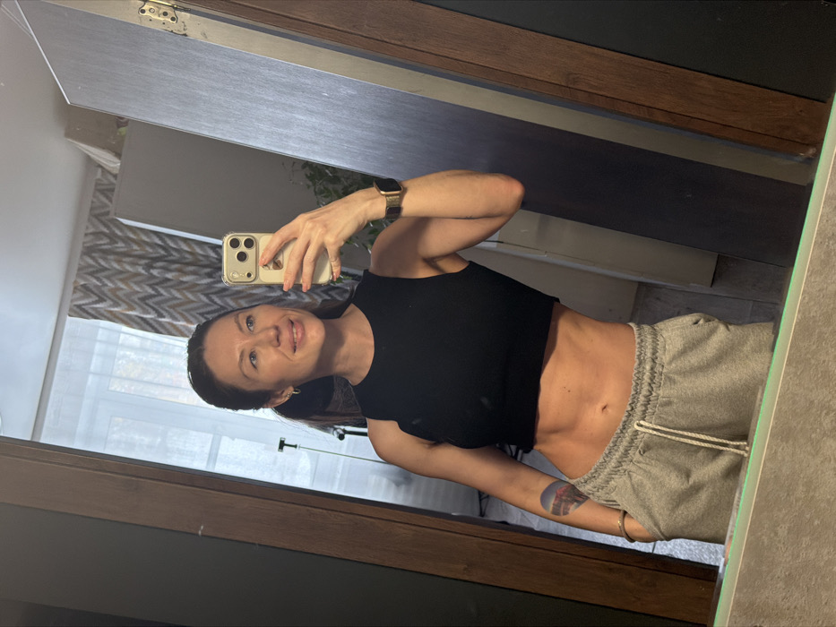 The image depicts a waist-up mirror selfie of an adult female taken indoors, in what appears to be a modern residential setting in Perm, Russia. The subject, with dark hair pulled back and a light complexion, stands with a subtle smile, facing slightly to her left. She wears a black sleeveless crop top, revealing a toned abdomen, and light grey sweatpants with a visible white drawstring; her left hand is casually placed in her pocket. A multi-colored tattoo, resembling a stylized landscape or sunset, is present on her upper left arm, above her elbow. On her right wrist, she wears a gold-toned smartwatch with a black band, and small hoop earrings are visible in both ears. She holds an off-white smartphone in her right hand, positioned to capture the reflection. The phone, likely an iPhone Pro model (indicated by the triple-lens camera array), is encased in a clear protective cover. The mirror itself features a wooden frame on the left side and a dark, possibly metallic, frame on the right. The background reflected in the mirror shows an interior room. A window on the left side allows natural light into the space, with sheer white curtains or blinds and patterned curtains featuring a brown and beige zig-zag design. A white lighting stand or tripod is partially visible near the window. To the right, a light-colored wall or furniture item is reflected, along with a dark wooden door frame or paneling. The lower edge of the mirror reveals a light grey, possibly tiled or stone, floor surface.