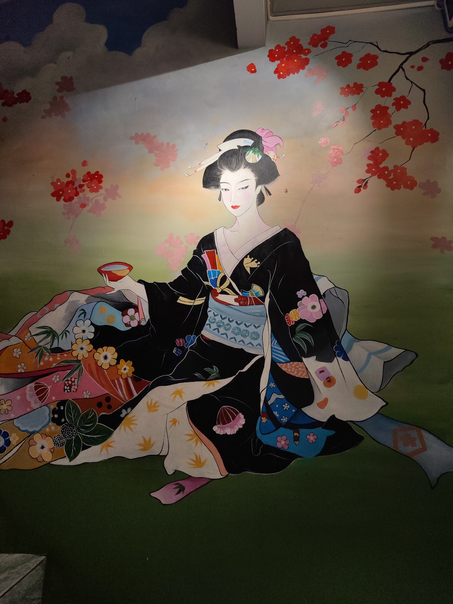 A full shot of a mural depicting a seated geisha in Cam Ly - Đà Lạt, Vietnam. The geisha is holding a small red bowl in her left hand. She is wearing a black kimono with a vibrant floral pattern. Her hair is styled traditionally, with a pink flower. The background features painted cherry blossoms, and the 'ground' is a solid green. There is an off-center highlight from an artificial light source. A small part of a ventilation system is visible in the top right. A grey stone corner is visible in the bottom left.
