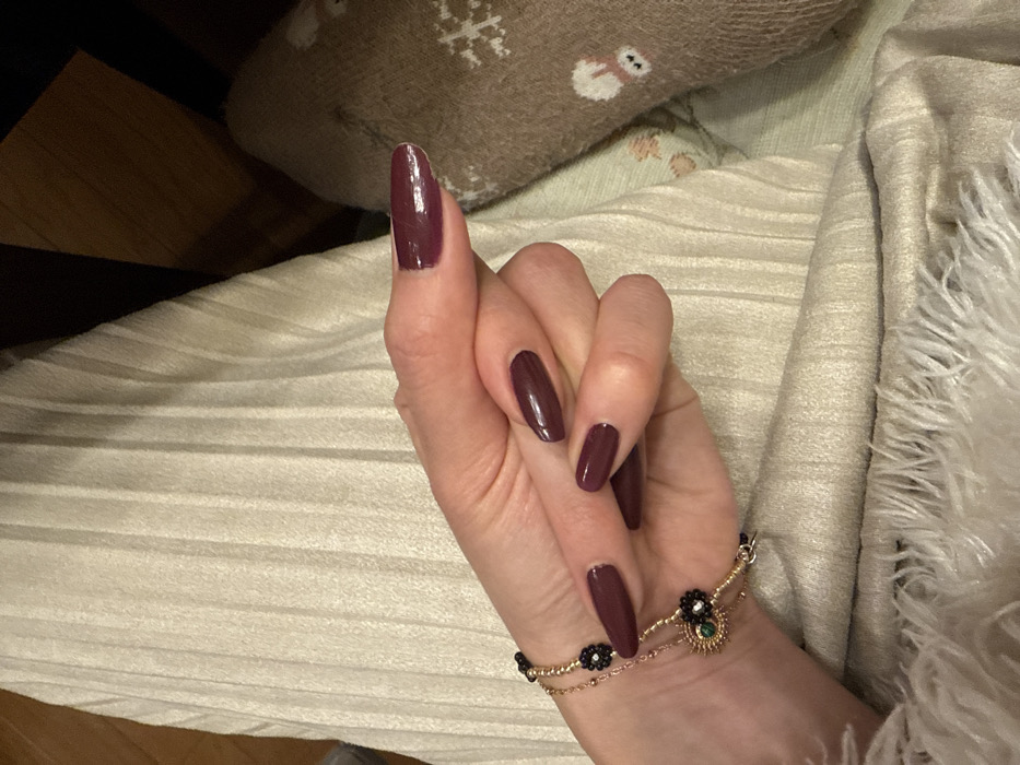 A human left hand is positioned over light-colored, vertically pleated fabric in an indoor setting in Kawasaki, Japan. The hand exhibits manicured fingernails with a glossy dark plum polish, shaped long and coffin-like. A multi-strand bracelet adorns the wrist, featuring gold-toned chains, black beaded floral elements, and a central charm with a green stone. Partially visible to the lower right is a brown, textured sock or slipper with white cartoon animal faces and snowflake patterns.