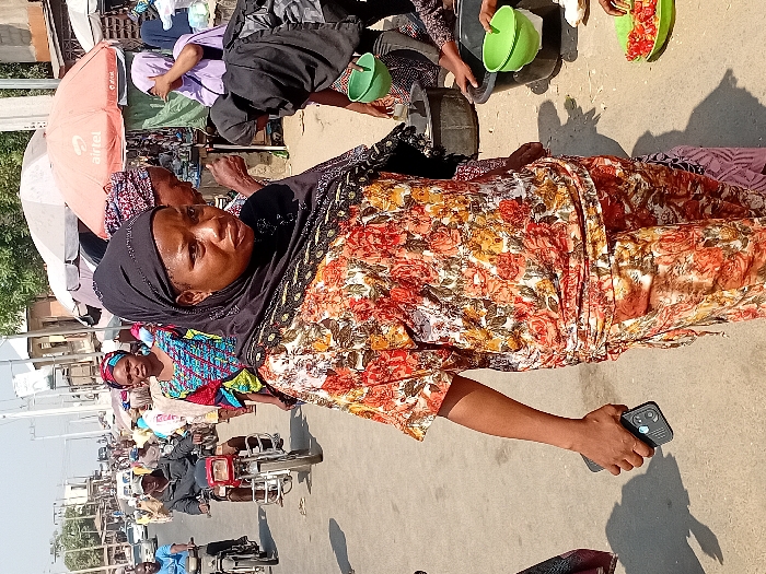 A woman in a floral dress and black hijab stands on a street holding a mobile phone. She looks towards the camera. In the background, there's a busy street with motorcycles and people. Another woman is beside her, wearing a colorful headscarf and dress. In the upper right, individuals sort items in colorful bowls. An orange umbrella marked "Airtel" stands nearby.