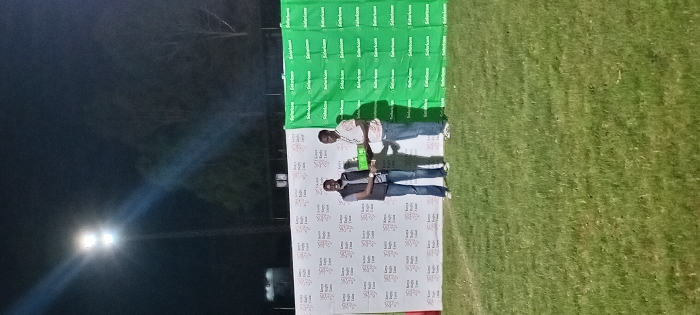 The image displays two adult males on a floodlit grass field at night, positioned in front of two large sponsorship banners. The banner on the left is white with repeated 'Kenya Rugby Union' logos, while the banner on the right is green with repeated 'Safaricom' branding. A tall floodlight pole with two active lamps is visible in the upper left of the frame, emitting a strong beam of light. The taller male, positioned on the left, is wearing a dark sleeveless jacket over a light-colored shirt, blue jeans, and light-colored shoes. He is jointly holding a green, rectangular object with the shorter male on the right. The male on the right, wearing a light-colored, patterned short-sleeved shirt, blue jeans, and white sneakers, appears to be presenting the object. Both individuals maintain a grip on the object with both hands during this exchange, and both exhibit neutral facial expressions. The scene is consistent with an award presentation or ceremony at a floodlit sports ground, likely a rugby pitch, in Nairobi, Kenya, given the identified Kenyan sports and corporate sponsorships.
