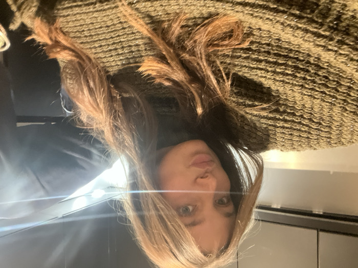 A woman is angled to the camera, wearing a green knitted sweater. She has light brown hair with highlights and fair skin. Her gaze is direct. Behind her is a dark, reflective surface, possibly a countertop or table, with some light reflecting off of it.