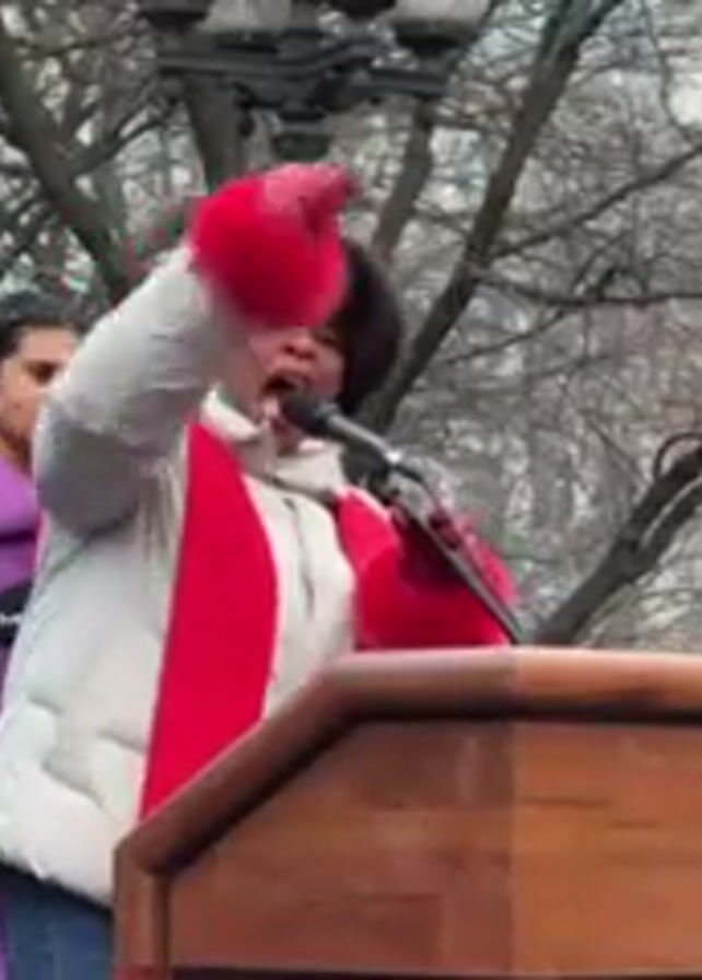woman speaking passionately at a podium outdoors. She is wearing a white puffy coat with a red scarf and red gloves with fur trim. She is raising her arms emphatically as she speaks into a microphone. Behind her are several people, including one man in a patterned jacket and a yellow scarf, and another person in a black coat. There is a microphone stand to the left of the podium, and bare trees in the background.