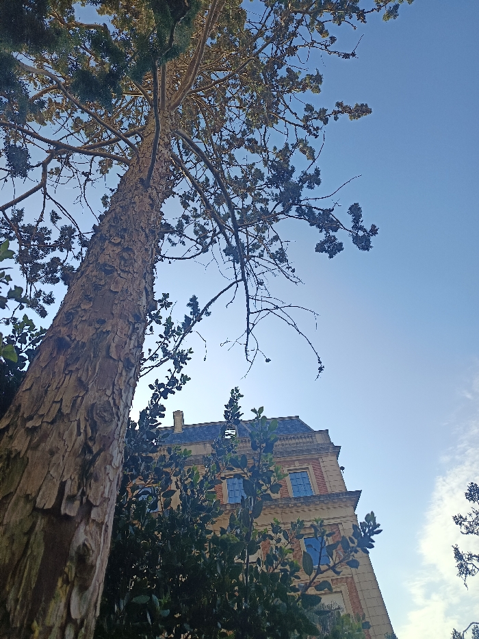 The image displays a low-angle, upward-looking perspective of the Palau Nacional on Montjuïc in Barcelona, Spain. A large tree, likely a conifer, with a thick, textured, brownish-gray trunk dominates the left side of the foreground, extending vertically and partially obscuring the building. Its branches, sparsely covered with dark green foliage, spread across the upper frame against the sky. In the midground, the upper sections of the Palau Nacional building are visible, characterized by classical architecture. The structure features light-colored stone or stucco facades, pronounced reddish-brown decorative elements around its numerous rectangular windows, and blue-tinted glass panes. A dark, possibly slate or tiled, mansard roof with architectural details crowns the building. Additional dense green foliage is present in front of the building, below the main tree trunk, further obscuring its lower portions. The background consists of a clear, bright blue sky with a few wispy white clouds visible towards the upper right. No individuals or discernible activities are present in the scene.