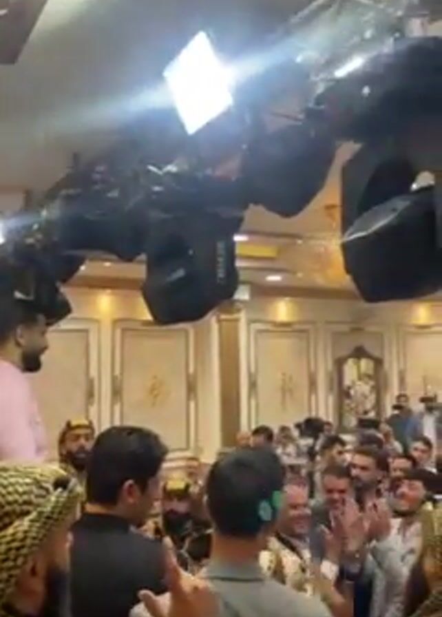 A large group of men are gathered in what appears to be a hall or ballroom, possibly for a celebration or wedding. Many are clapping and smiling, some are dressed in traditional Middle Eastern clothing, including keffiyehs. A man in a pink shirt is being held aloft on someone’s shoulders. Above the crowd, there is a professional lighting rig with spotlights and audio speakers. The room is decorated with ornate molding and gold accents.