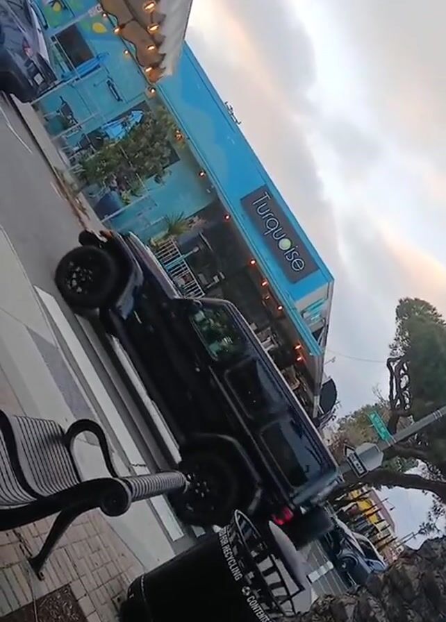 The video, shot from ground level, shows a street scene on an overcast day. A black Jeep Wrangler drives past a crosswalk in front of a turquoise building labeled "Turquoise." The camera pans upwards, briefly showing a tiled awning with string lights, then tilts back down to capture palm trees and various buildings across the street. A man in a green jacket and shorts walks across the crosswalk. The video ends with a close-up of a palm tree trunk and a black recycling bin.