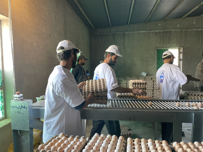 The image depicts an indoor egg processing and packaging facility located in Shuyene Vosta, Afghanistan