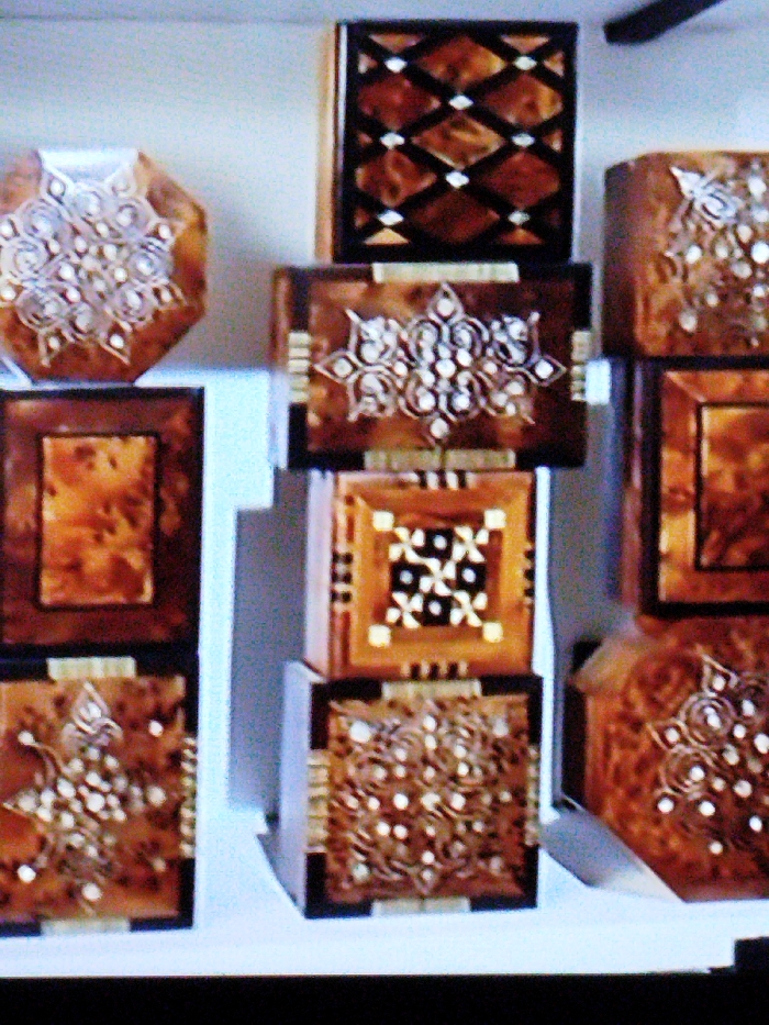 The image displays a detailed view of multiple decorative inlaid wooden boxes, characteristic of Moroccan craftsmanship