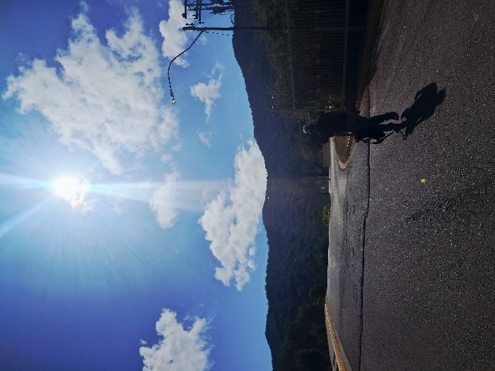 A cyclist and their shadow are positioned on a road next to a mountain. The sky is blue with scattered white clouds and a bright sun shining. A utility pole stands along the road. A fence borders the road. The overall view conveys a sunny, outdoor scene with nature and human activity coexisting.
