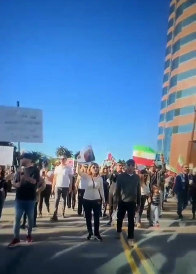 crowd of people marching in a street. Some are holding Iranian flags and signs, one of which reads "WOMEN-LIFE-FREEDOM" in both English and Farsi, along with "Jina-Mahsa Amini." The sky is clear blue, and there is a tall building in the background. People are walking down the middle of the street, between the lane markers. The video is shot from ground level, seemingly from within the crowd, and there appears to be a speaker playing music. The overall impression is of a political demonstration advocating for women's rights and freedom in Iran.