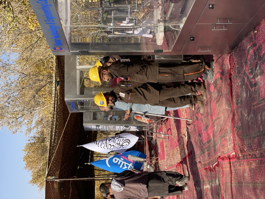 The image depicts an outdoor event or exhibition in Sard-E 'olya, Afghanistan. The ground is covered with multiple overlapping red, patterned carpets. In the foreground and midground, several men are present. On the right, two men stand in brown work uniforms with orange piping and yellow hard hats; the man on the left has a blue "C" logo on his hard hat. They are positioned near a series of large, stainless steel industrial machines with clear panels, one of which bears the text "Sawar Technology & Engineering Co." To the left of these machines, a man in a light blue tunic holds a silver crutch. Further left, a man in dark traditional clothing walks away from the camera. Two flags are prominently displayed: a blue flag with white Arabic script (possibly "MILKO") and a white flag with black Arabic script (the flag of the Islamic Emirate of Afghanistan). Foldable metal chairs are scattered on the carpets. In the background, a patterned canopy structure provides shade. Beyond this, deciduous trees with sparse, yellowish-brown autumn leaves are visible against a clear blue sky. The scene is illuminated by natural daylight, casting shadows.