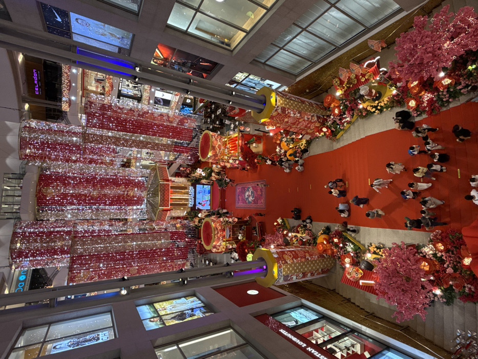 The image depicts the multi-story interior atrium of Pavilion Kuala Lumpur, Malaysia, decorated extensively for a festive occasion
