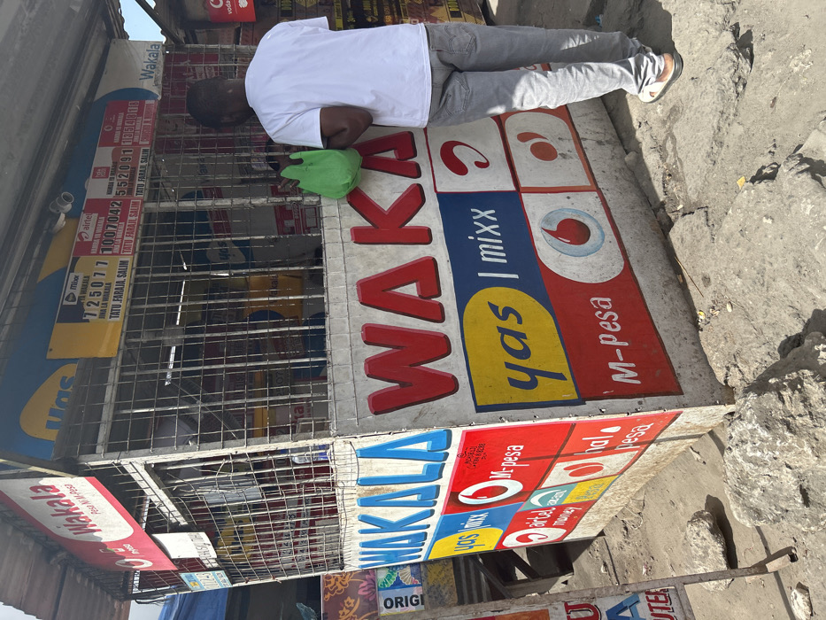 A man in a white shirt and gray pants is lying on top of a shop. The shop's sign is predominantly red, white, blue, and yellow, with logos for Vodafone, Airtel, and M-Pesa. Text on the sign includes "WAKALA," "yas | mixx," and contact numbers. The shop has a metal grid covering the windows, and additional signage is visible below. The scene is outdoors on a concrete surface.