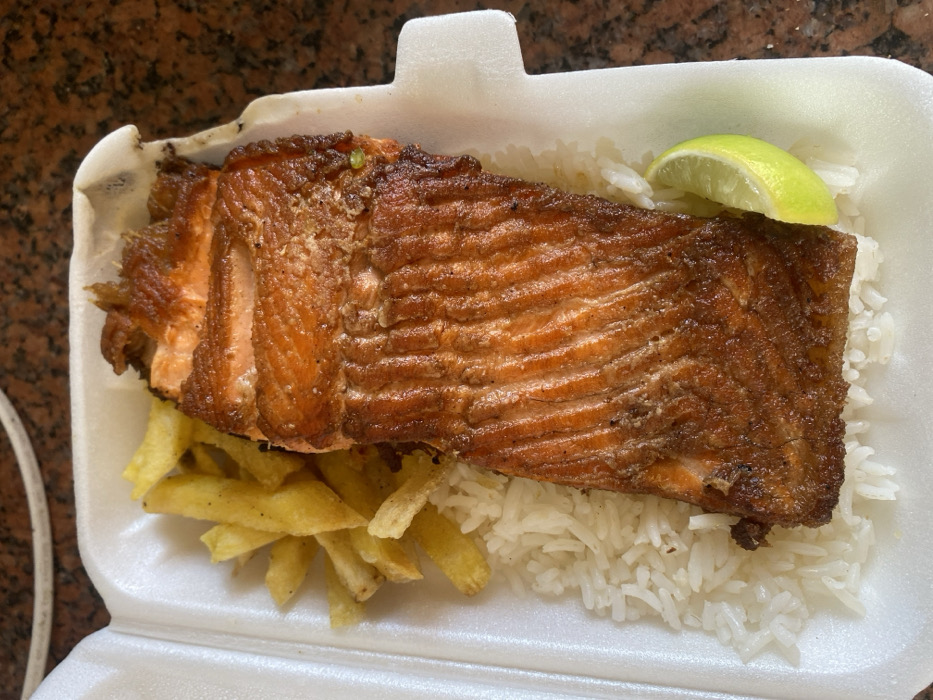 A takeout container holds a meal of salmon, rice, and fries. The salmon is a large, rectangular filet with a browned, textured surface. It sits atop a bed of fluffy, white rice, with a wedge of lime placed next to it. A small portion of golden-brown French fries is tucked beside the salmon. The container is made of white styrofoam.
