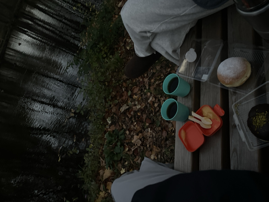 The scene depicts an outdoor setting in a park-like area adjacent to a body of water in Vienna, Austria, viewed from a first-person, seated perspective on a wooden bench. Two individuals are present, identified by their lower legs and feet visible within the frame. The person on the left wears light grey trousers and dark footwear, while the person on the right wears light grey sweatpants and a dark brown shoe. On the wooden bench surface between the individuals, an assortment of food and drink items is arranged. These include two teal-colored plastic cups, each containing a dark liquid. An open orange plastic container holds a quantity of residual yellow food and two small wooden spoons. Nearby are two transparent plastic containers: one contains a donut generously dusted with powdered sugar, and the other holds a dark, round pastry topped with green pistachio fragments. Beyond the bench, the ground is densely covered with fallen brown and yellow autumn leaves, interspersed with patches of dark green vegetation. The background features a calm body of water, reflecting the dark, vertical forms of trees. The ambient lighting is subdued, suggesting late afternoon, dusk, or an overcast day.