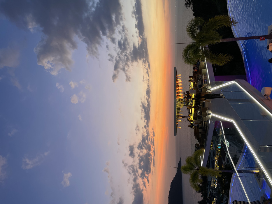 The image displays an elevated outdoor bar and lounge facility at sunset in Karon, Thailand