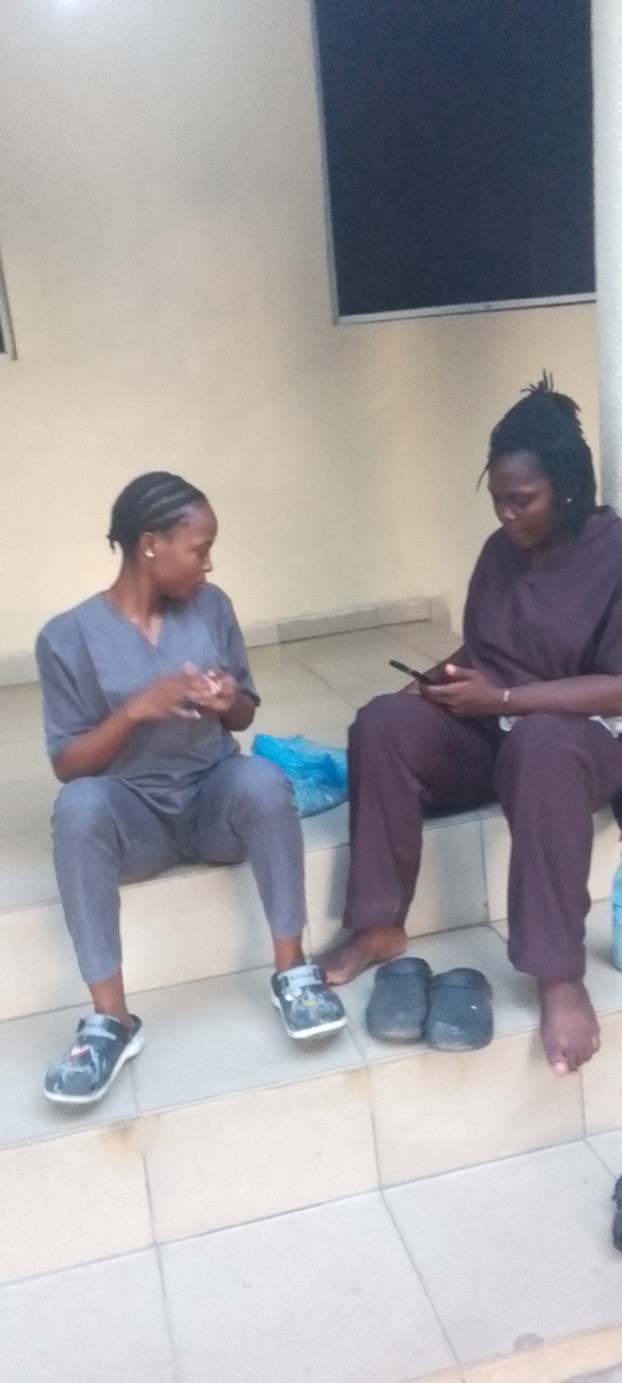Two women in scrubs sit on steps. The woman on the left has braided hair, gray scrubs, and colorful clogs. She looks at her hands. The woman on the right has dreadlocks, maroon scrubs, and holds a phone. Her shoes are next to her bare feet. A blue bag sits between the women. A water bottle and dark shoes are next to the woman on the right. A window is visible in the background.