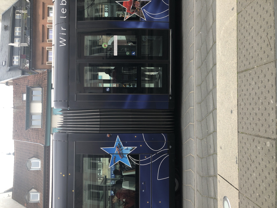 - "An articulated dark blue tram with a festive star and swirling line graphic motif, including scattered gold stars and partial text "Wir leb" by FM-pYD9x2, licensed under CC BY 4.0