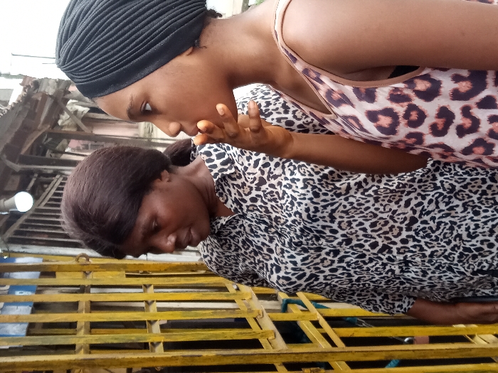 Two females are depicted outdoors in Umuode, Nigeria. On the left, an adult woman with dark brown hair, wearing a black and white leopard print collared shirt, stands facing slightly right, with her mouth slightly open. To her right, a younger female, wearing a black pleated headwrap and a brown and black leopard print sleeveless top, has her right hand raised to her mouth, with an orange-brown substance visible on her fingertips. Both subjects have dark skin tones. Behind them, a yellow metal gate or security screen is visible to the left. Above, a bare lightbulb hangs. The background further right shows blurred, possibly wooden or metal, structural elements.