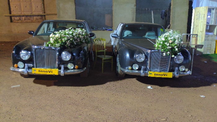 Two vintage black cars sit side-by-side, adorned with bouquets of white flowers. Each has a yellow license plate with "InnoVi" on it. A gold chair is placed between the cars. The ground appears to be a dirt lot. There are buildings in the background.