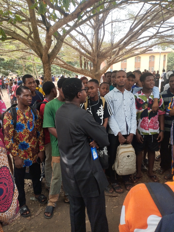 The scene depicts an outdoor gathering of approximately 20-30 individuals, predominantly young males, under several large, bare-branched trees on unpaved ground in Ihiagwa, Nigeria. In the immediate foreground, a male figure is observed from behind, wearing a dark-colored tunic and trousers, with an ID badge on a blue lanyard. He stands with his arms crossed. He appears to be engaged in interaction with a group of approximately 10-15 young males facing him. These individuals are dressed in various casual attire, including colorful patterned shirts, t-shirts, and button-up shirts. One male on the left side of the frame wears a multi-colored patterned shirt and a dark backpack. Another male, visible slightly right of center, wears a light-colored striped shirt and holds a beige backpack in his left hand. Most individuals wear sandals or flip-flops. In the background, a multi-story, light brown building with multiple windows is visible, suggesting an institutional or campus environment. Additional blurred figures are present in the distant background. The ground is dry, uneven soil. The scene is illuminated by natural daylight.