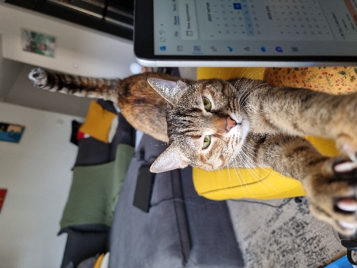 The image depicts an indoor scene in an apartment located in Ramat Gan, Israel. A brown tabby cat with narrowed eyes and partially extended claws stretches its front paws towards the viewer, occupying the central foreground. It is positioned on a yellow cushion or chair. Behind this cat, the rear torso and a striped tail of a calico or tortie cat are visible, indicating movement or a second cat stretching. To the right of the foreground cat, a vertically oriented smartphone or small tablet displays a calendar application showing dates for "2024" and Hebrew text for "week," "month," and "year." In the background, a dark grey sectional sofa with a green blanket and a yellow cushion is visible, with a black laptop resting on it. The floor is covered by a light-colored, patterned rug. The wall in the background is white and features several framed artworks. No people are visible.