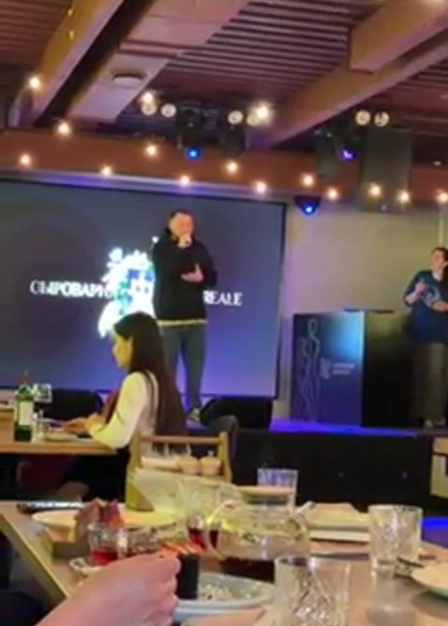 The scene captures a restaurant interior where a man is performing on a stage. He is dressed in a casual outfit, including a black hoodie, and is holding a microphone, gesturing with his free hand. A screen behind him displays a logo with the text "СЫРОВАРНЯ REALE". To the right of the stage, a woman is standing and appears to be either adjusting the sound or coordinating something related to the event. In the foreground, people are seated at tables, some eating, and others looking at their phones. The tables are set with dishes, glasses, and wine bottles. The restaurant features a wooden ceiling with exposed beams and hanging lights. The focus seems to be on the stage performance, with the attendees engaging in their meals and activities.