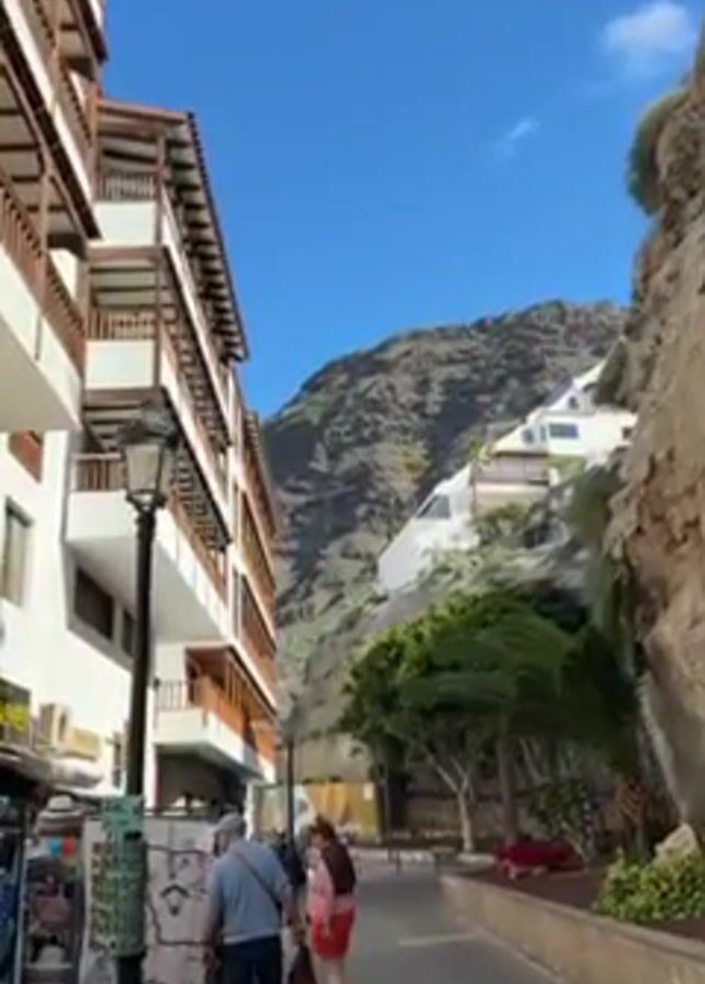 pedestrian walkway bordered by a multi-story building on one side and a rocky cliff face on the other, set against a mountain backdrop under a bright blue sky with a few clouds