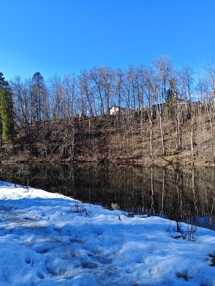 This image depicts a natural landscape in Lopukhinka, Russia, under a clear, bright blue sky. The scene is bisected horizontally by a dark, calm body of water, likely a river or stream, which reflects the sky and surrounding trees. On the far bank, a steep hillside is densely covered with slender, bare deciduous trees, indicative of late winter or early spring conditions. A small, light-colored building with a dark roof is visible amidst these trees on the upper slope, positioned slightly right of the frame's center. To the far left, a cluster of evergreen trees with dark green foliage stands apart from the bare trees. The foreground consists of an uneven expanse of melting snow along the near bank of the water, exhibiting variations in white and darker, possibly wet or soiled, areas. Sparse, dark plant stems or debris protrude from the snow and near the water's edge. No individuals or animals are present.