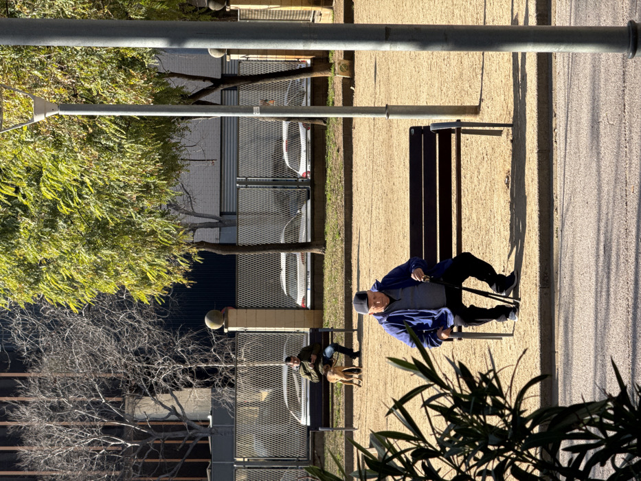 The scene is set in a public park or plaza in L'hospitalet De Llobregat, Spain, under bright daylight with distinct shadows. The ground is composed of light brown gravel or sand. In the mid-foreground, an elderly male is seated on a dark brown slatted park bench with a metal frame. He wears a dark blue baseball cap, a grey long-sleeved shirt, a blue jacket, dark trousers, and dark athletic shoes. His hands rest on a black walking stick positioned vertically between his legs. He is observed looking downwards. Further back, in the mid-background, a second male is seated on an identical dark brown park bench. He is dressed in a dark olive-green jacket, blue jeans, and dark shoes, and is looking down at a mobile phone held in his hands. A medium-sized, light brown dog stands on the ground, positioned between the seated man's legs. A grey metal mesh fence, supported by metal posts and featuring two light-colored stone pillars topped with spherical finials, extends across the background. Behind this fence, three white vehicles, appearing to be compact cars or hatchbacks, are parked. Beyond the vehicles and fence, a dark multi-story building and a lighter-colored structure are partially visible. Vegetation includes several trees with vibrant green foliage, predominantly in the mid-ground and background, along with bare-branched deciduous trees in the far background. A dark green leafy plant is partially visible and out of focus in the immediate left foreground. Multiple grey utility poles, including one prominent in the right foreground, are present, casting long, sharp shadows to the right, indicating direct sunlight.