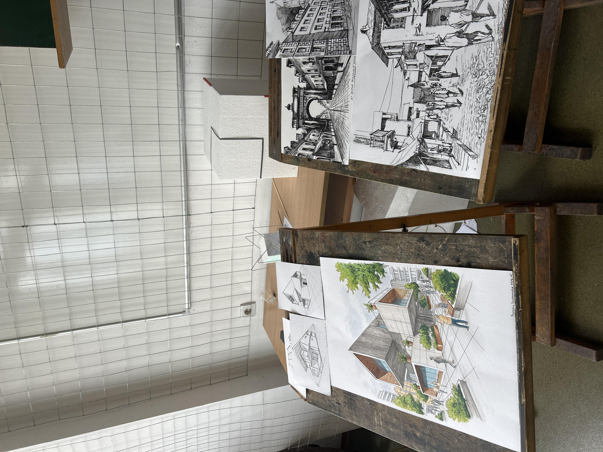 two easels in a room with a white tiled wall. On the first easel are three architectural drawings in black and white, depicting urban scenes with buildings and people. On the second easel are architectural drawings of a modern building with landscaping and figures. There are also additional drawings leaning against the easel. The location is implied to be a studio or classroom. The city is not apparent.