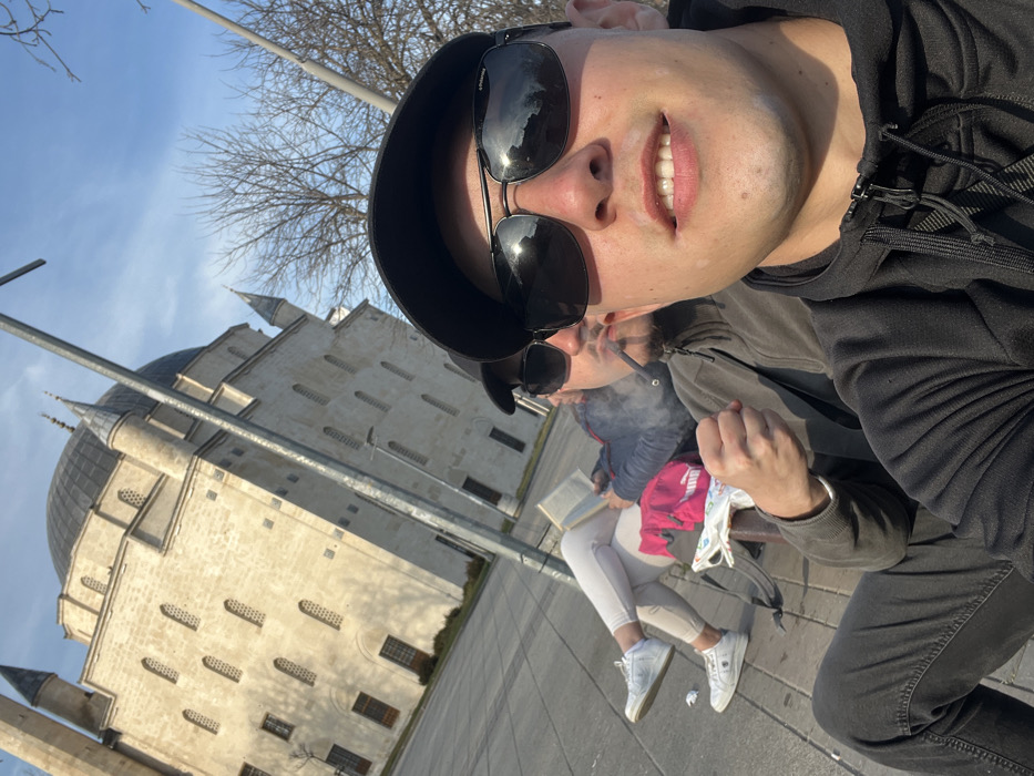 - "Three individuals are seated on a wooden bench outdoors under a clear blue sky, with a prominent mosque in the background" by FM-ddoUt1, licensed under CC BY 4.0