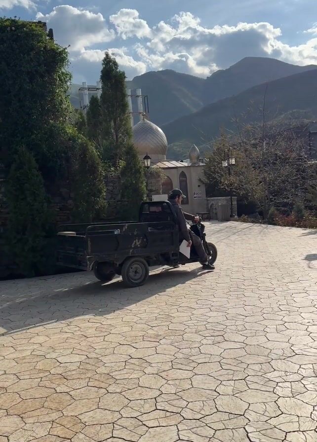A man on a tricycle truck is driving down a stone-paved road. The man is wearing a dark coat and pants. He is holding a piece of paper in his left hand. The tricycle truck is dark green or black. The road is made of irregular, tan-colored stones. To the left is a stone building with greenery growing on it. Behind the truck is a building with a silver dome and windows. In the background are mountains. The sky is blue with white clouds. The sun is shining in the upper right of the frame. A small dog appears on the right side of the road as the truck passes. The camera pans with the truck, keeping it in the center of the frame.