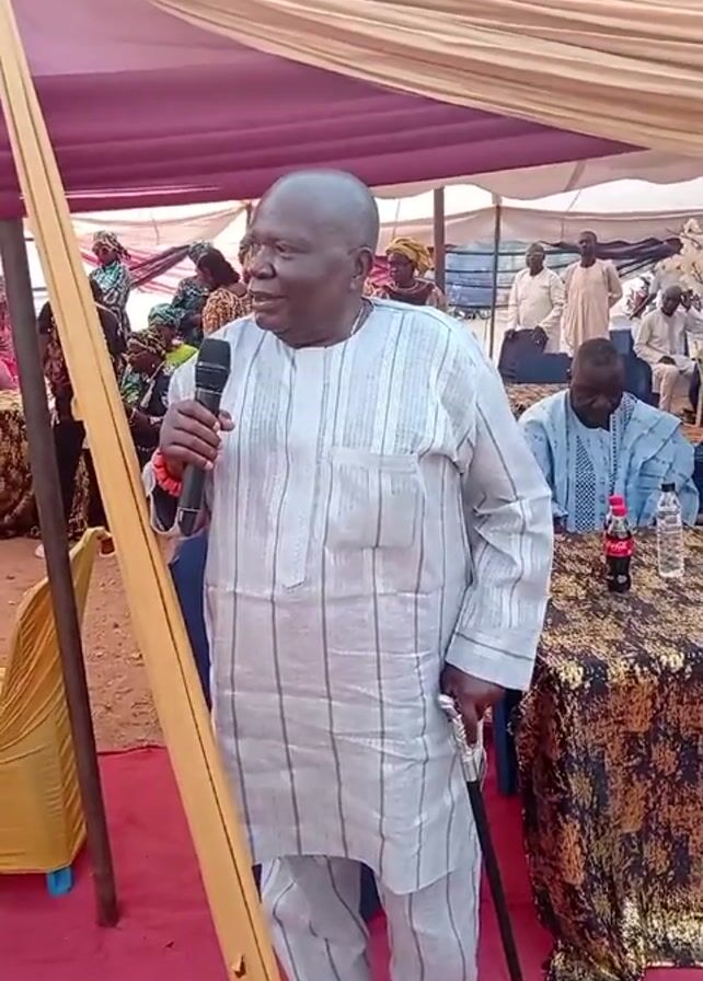 n older man speaking into a microphone at an event. He is wearing a striped traditional African tunic and trousers. He holds a cane in his left hand. The man stands under a large tent. Behind him, other people are seated at tables covered with decorative cloths. Bottles of Coca-Cola and water are visible on the table. The backdrop appears to be an outdoor setting with trees and other structures in the distance.