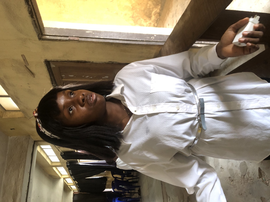 A woman is standing in a room with a window and some chairs. She is wearing a white, button-down shirt with a belt, and has long black hair with a headband. She is holding a white object, possibly an electrical plug, in her right hand. The room has a worn appearance with older features on the walls. Some clothing items hang in the background.