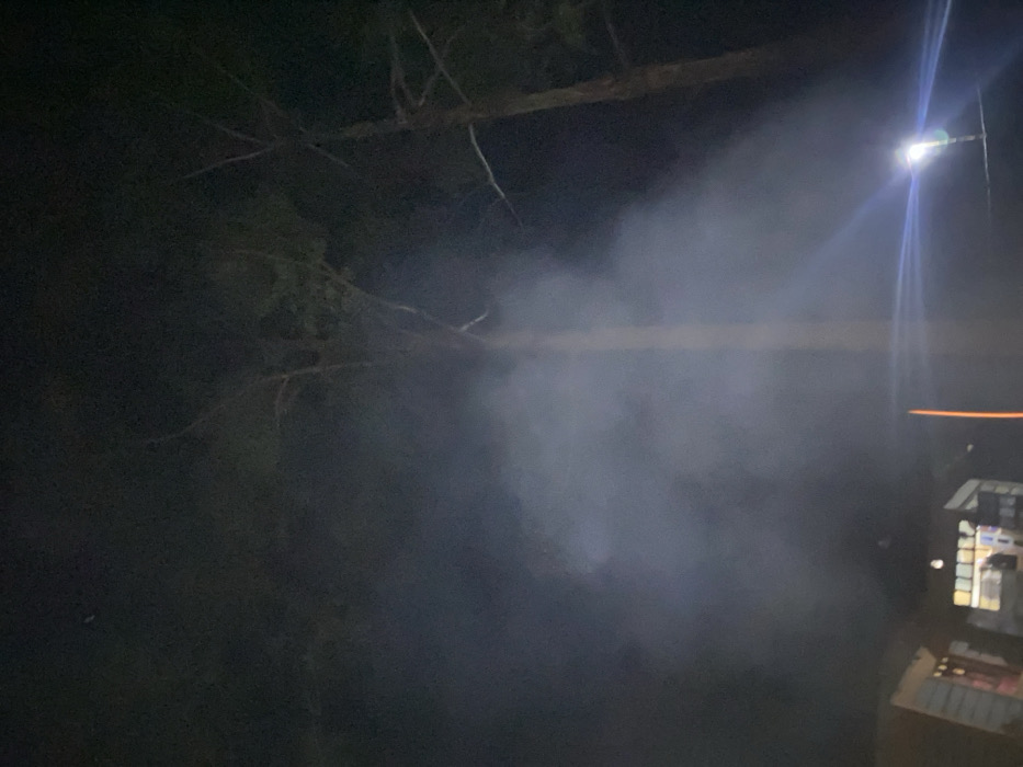 Darkness engulfs the scene. Branches reach across the top left. A hazy cloud obscures the center. To the right, a structure with illuminated windows is visible, a light post shines brightly above. The orange glow suggests a fire further away. The overall impression is of a night scene obscured by smoke or fog.