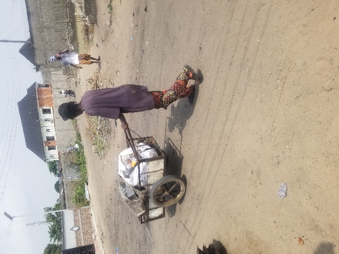 An unpaved street scene in Lagos, Nigeria, under a bright, possibly overcast sky, features two individuals and various structures. The central figure, an adult wearing a dark purple tunic and patterned trousers, is viewed from behind, pushing a two-wheeled, metal-framed cart laden with assorted scrap materials, including a large white bundled item and a dark rectangular object. The light brown dirt road exhibits visible tire tracks and scattered debris, including a crumpled plastic item in the immediate foreground. In the mid-ground, a second individual, wearing a white t-shirt, light brown shorts, and a white headwrap, walks away from the viewer, glancing over their right shoulder. The background includes a multi-level building with white walls and red brick accents, topped with a dark hip roof. To the right, a segment of an unfinished concrete wall with exposed rebar and barbed wire is visible. To the left, a patterned concrete fence with a dark metal gate and a tall pole equipped with a solar panel and light fixture are present.
