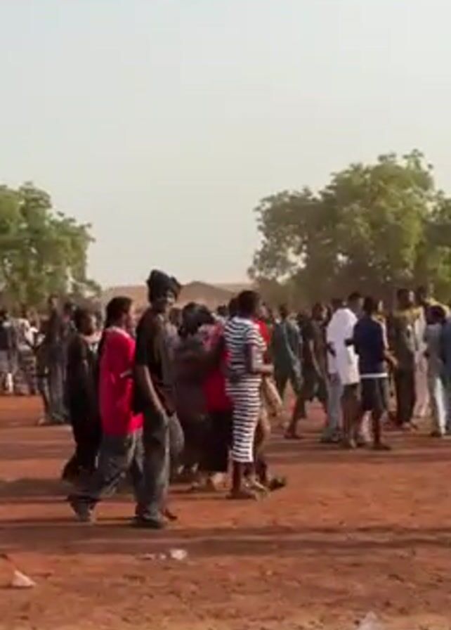 bustling outdoor gathering of numerous people on a dirt ground. A yellow school bus is visible in the background, along with a building and some trees. The sky appears hazy. People are walking and interacting, with some individuals wearing distinctive, colorful costumes that resemble shaggy, furry figures. The ground is covered with dirt, and there are scattered pieces of trash. The overall atmosphere suggests a festival or cultural event taking place.