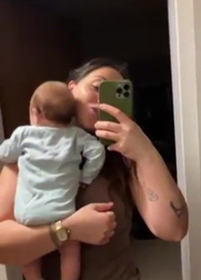 A woman with long brown hair takes a selfie in a mirror while holding a baby. The woman wears a brown shirt and a watch. She has a tattoo on her left arm. The baby wears a light blue onesie and white socks. The woman kisses the baby's head. The woman is using a green iPhone. The room appears to be a bathroom with dark brown walls.