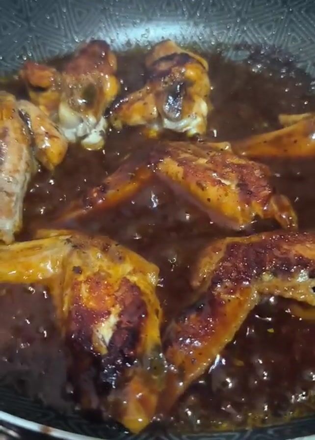 - "chicken wings cooking in a dark, syrupy sauce in a grey non-stick frying pan" by FM-HAEJF3, licensed under CC BY 4.0