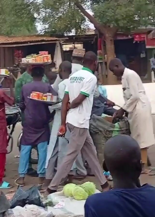 The scene shows a bustling outdoor marketplace. People in various attire, including traditional clothing, are moving about. Some individuals are gathered around vendors, examining goods like vegetables. A person wearing a shirt that reads "World Roast" stands out in the crowd. The camera shifts perspective, showing different angles of the market and the diverse array of people present. The atmosphere suggests a lively commercial exchange.