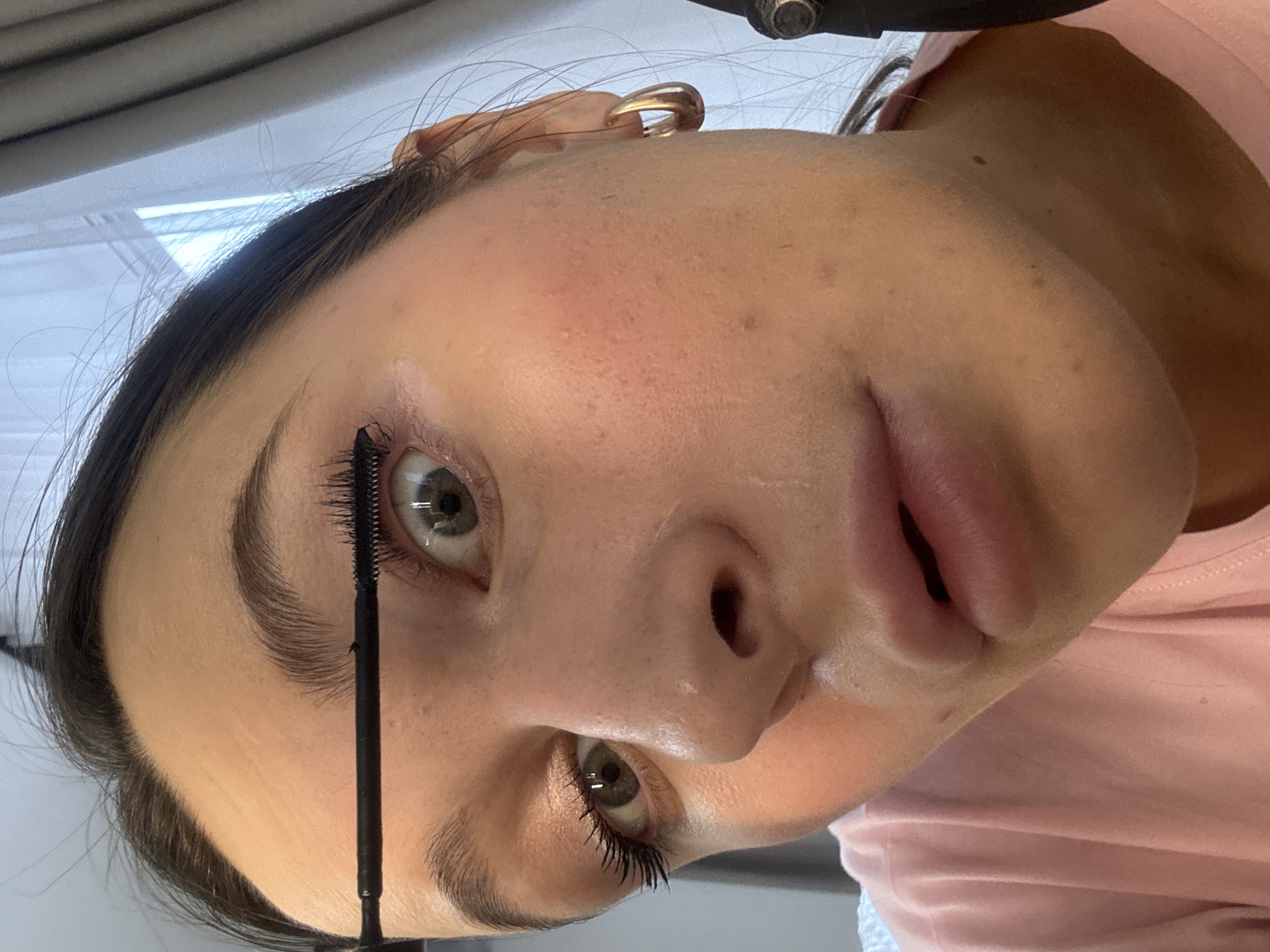 A forensic close-up image taken in the city of Vnukovo, Russia, captures the upper facial region of an individual. The subject, exhibiting a light skin tone and dark hair, is actively applying mascara to the right eye (viewer's left), with a black mascara wand positioned horizontally across the upper lash line. The right eye is open wide, featuring a dilated pupil and distinct light reflections. The left eye (viewer's right), partially visible, also displays mascara-coated upper lashes. The subject's mouth is slightly open. A gold-colored hoop earring is visible on the right earlobe. A pink fabric, consistent with clothing, is present in the lower left portion of the frame. The background, diffused, suggests an indoor environment with vertical elements, likely curtains or blinds, on the right.