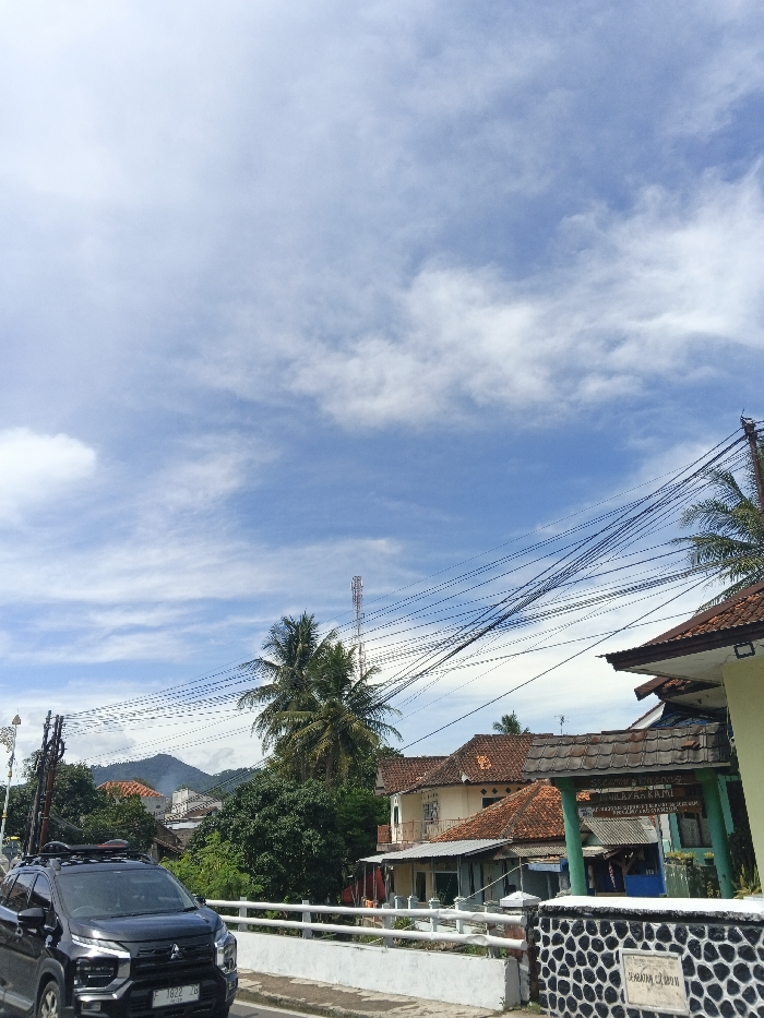 Bright daytime scene with a partly cloudy sky above a street. A black SUV sits on the left, positioned next to a low white wall topped with decorative black and white stone. Beyond the wall, there are buildings with red tile roofs interspersed with lush green trees, including palm trees. Overhead, power lines crisscross the sky. A communications tower is visible in the distance. The overall composition suggests a residential area with a mix of natural and urban elements.