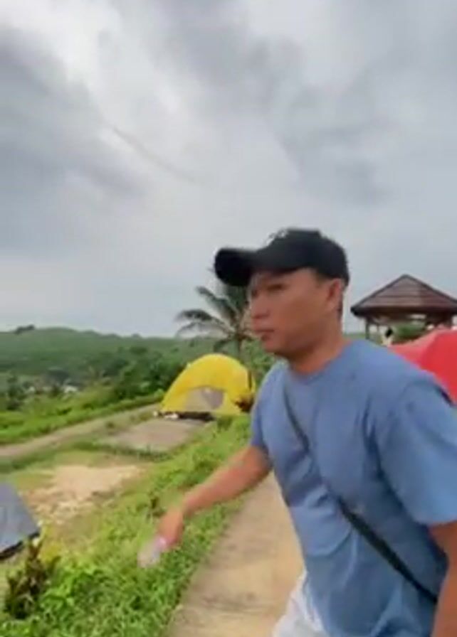 man in a blue shirt and black cap, pointing towards the ocean from a campsite. There are three tents visible: red, grey, and yellow. The campsite is grassy with a paved walkway, with the tents erected on concrete pads. A small gazebo stands near the red tent. A palm tree is located near the yellow tent. The sky is overcast. The camera pans to show the ocean view.