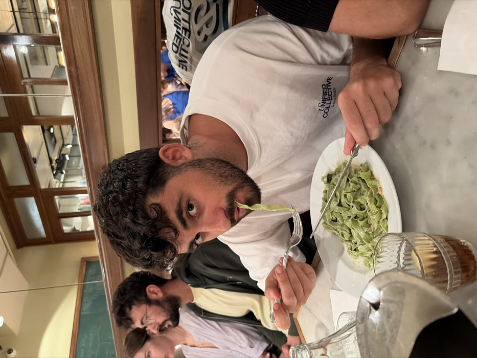 The image captures an indoor dining scene at Brasserie M&R in Tel Aviv, Israel, identifiable by its classic European-style interior featuring dark wooden paneling and mirrored sections. A male subject, approximately 25-35 years old with dark curly hair and a beard, is centrally positioned, seated at a light grey marble-patterned table. He wears a white t-shirt with "UNIFIED COLLECTIVE" printed on the chest. He is actively eating green pasta from a white plate, with a single strand of pasta protruding from his mouth, and is looking directly at the camera. His right hand holds a silver fork, while his left hand holds a silver knife resting on the plate. To the left of the main subject, another male, also with dark hair and a beard, wearing glasses and a light-colored top under a dark jacket, is visible in profile, looking towards the left. Partially visible further left is a female with light hair. On the table, a clear glass bottle and a ribbed glass containing a dark liquid with a lemon slice are present. The background features reflections of other diners and interior elements within ornate wooden frames, along with a dark green board visible on the far left.