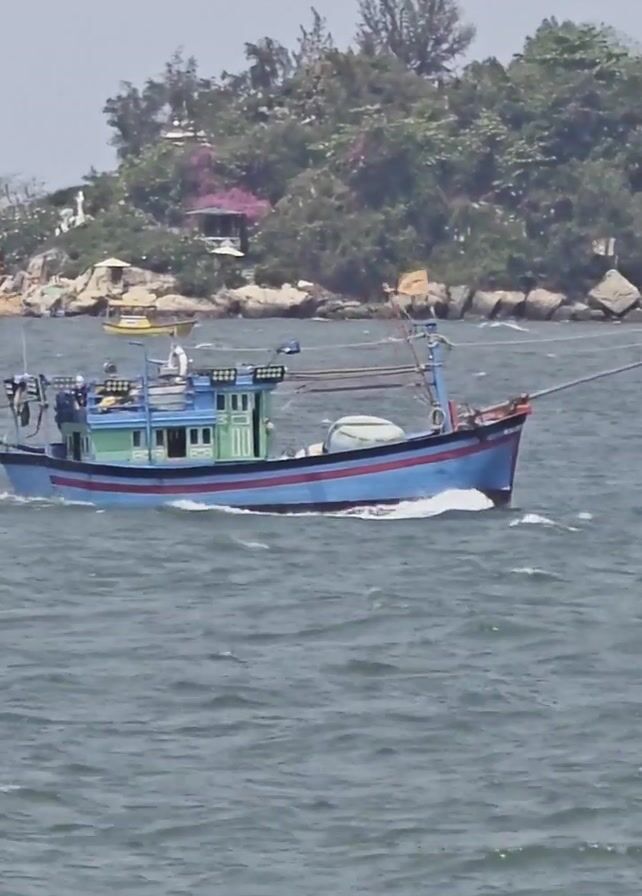A blue and green fishing boat moves across choppy water, heading toward the viewer. The boat has a cabin in the middle, poles and ropes for fishing, and a red stripe near the top. In the background, a rocky shoreline with trees, buildings, and what appears to be a pink gazebo is visible.